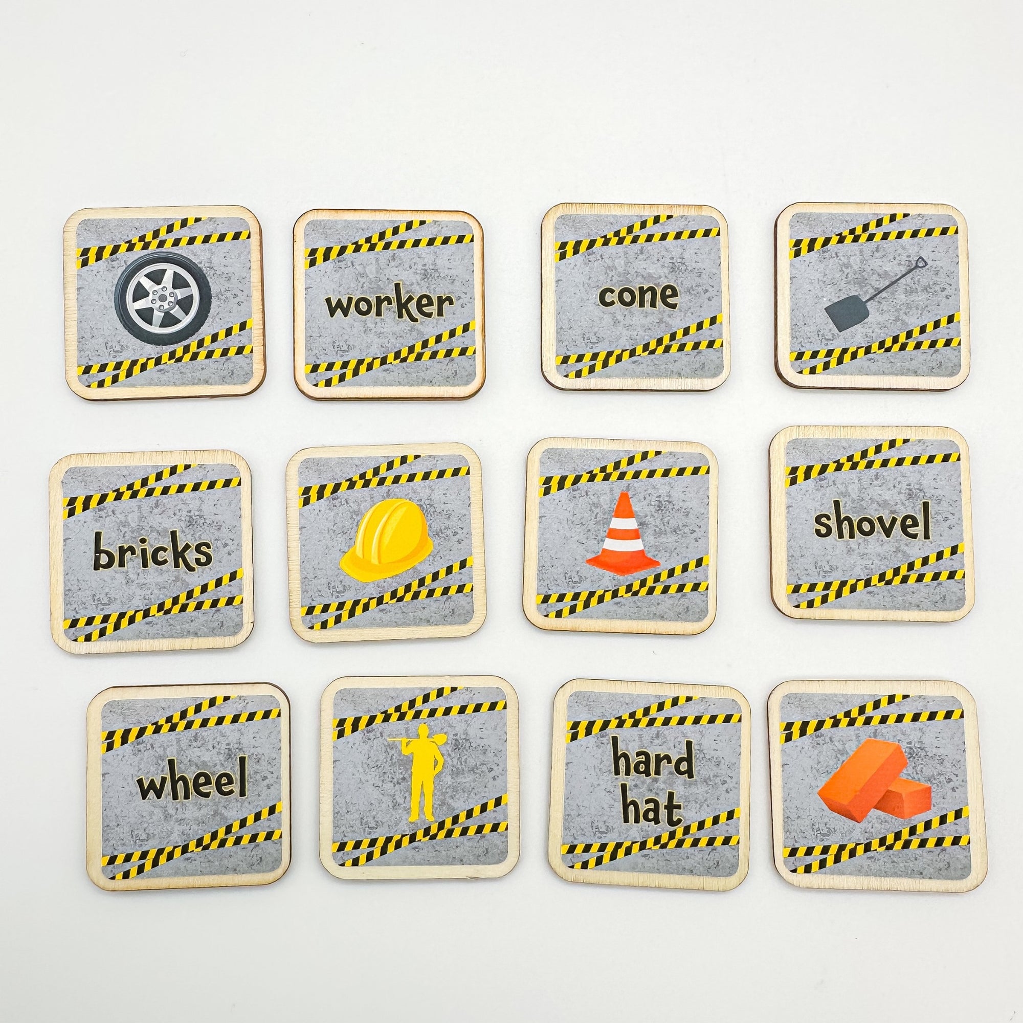 This construction-themed matching game contains 12 (2 each of 6 images) circular wooden tokens. The tokens measure 1.5 inches in diameter and have a smooth finish that is nice for small hands. This is a travel-sized game. Images are printed onto matte stickers.